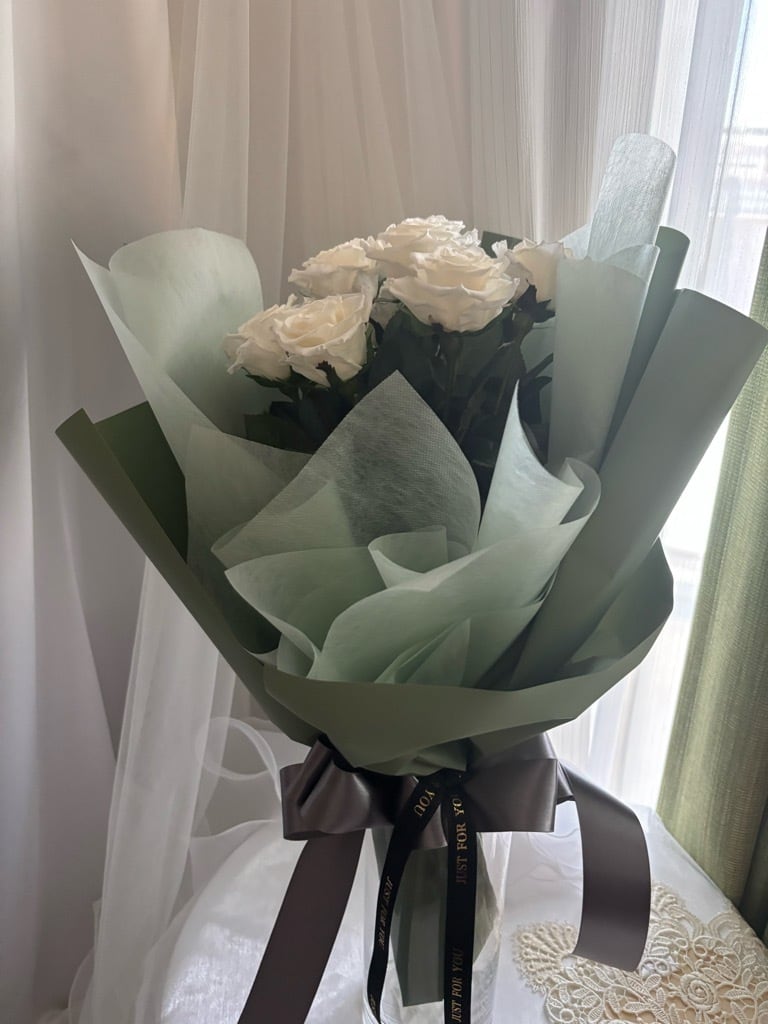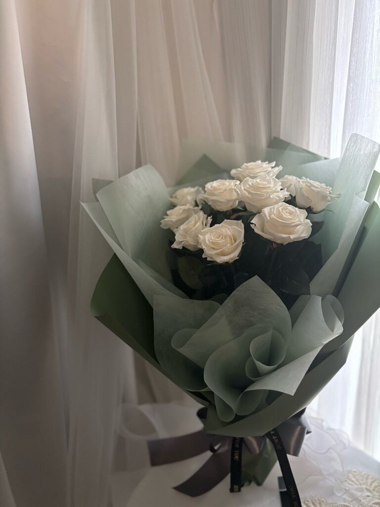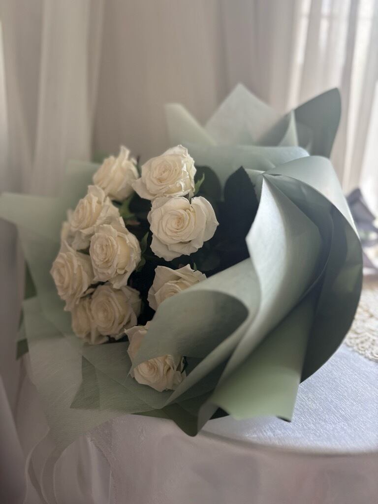 より美しく、より深い想いで包み込むホワイトローズの花束。